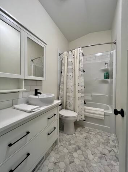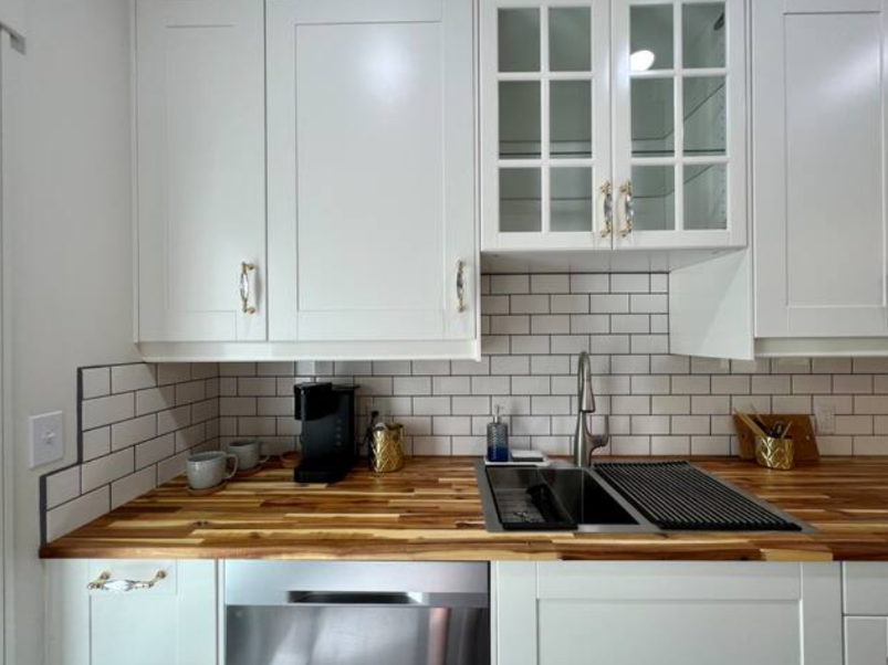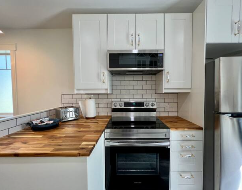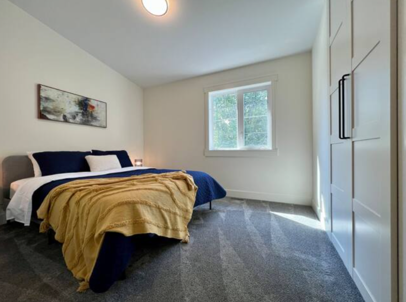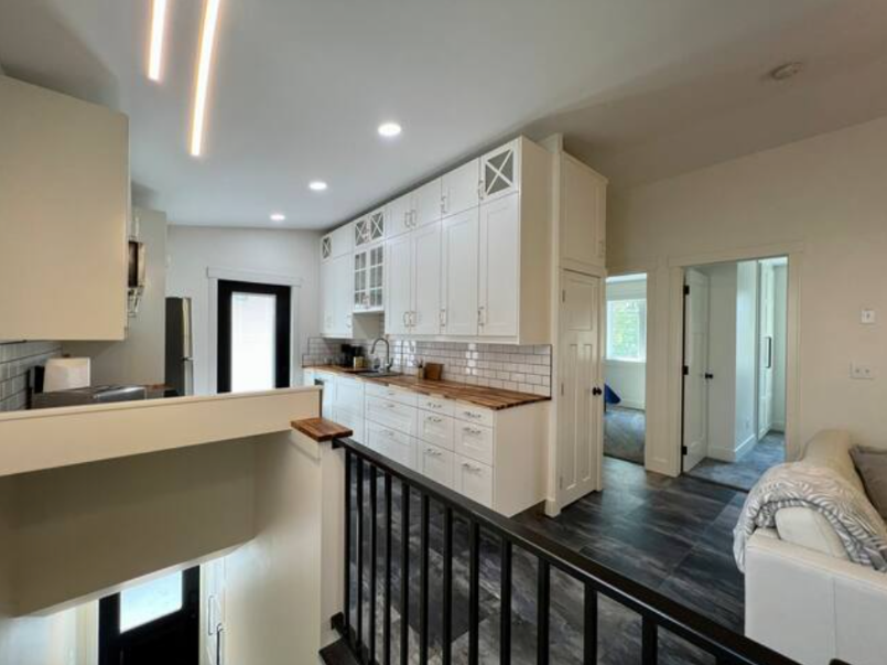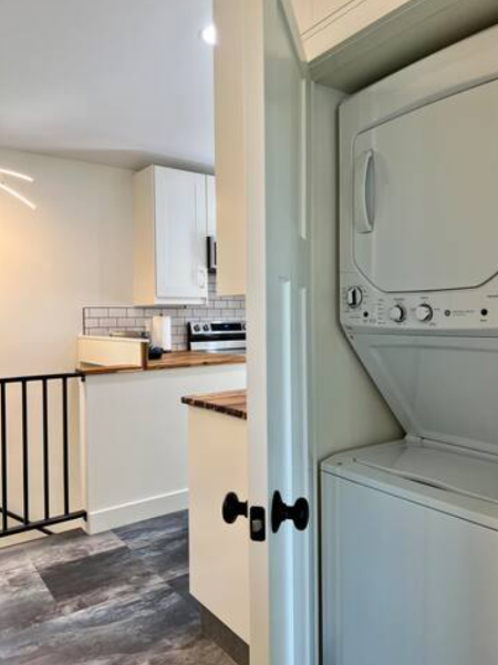 This is a newly built above-garage coach house with in-suite laundry, wifi, a full kitchen and a balcony! It features designer decor with butcher block countertops, glass and gold cabinet hardware and floor-to-ceiling cabinetry. Only 1 block from Chinook Hospital, this unit is bright, immaculate and well-equipped for both short-term and longer-term stays. The suite has 2 bedrooms and 1 full bathroom and is suitable for a maximum of four people. From your private parking pad, you enter through your private entrance and up a flight of stairs to the suite. Ceilings average 9' - 11'. The suite also includes a private stacking laundry set.
