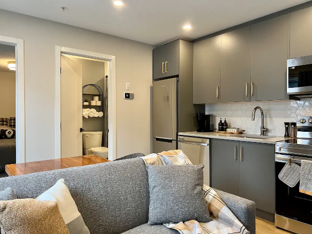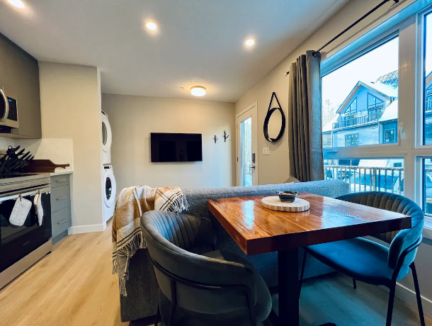 Just steps from shops, cafes and breweries, this cozy ground level pet-friendly unit is in a brand new building. Free-parking is provided. Bring Fido (or a friend) and enjoy all that the Bow Valley and Rocky Mountains have to offer year-round. Tastefully furnished and well-appointed, this 1 bed, 1 bath ‘micro suite’ is your hotel room on steroids. This unit sleeps up to 4 people, although a little snug with 4 adults - it’s ideal for a couple + kid or pet.
